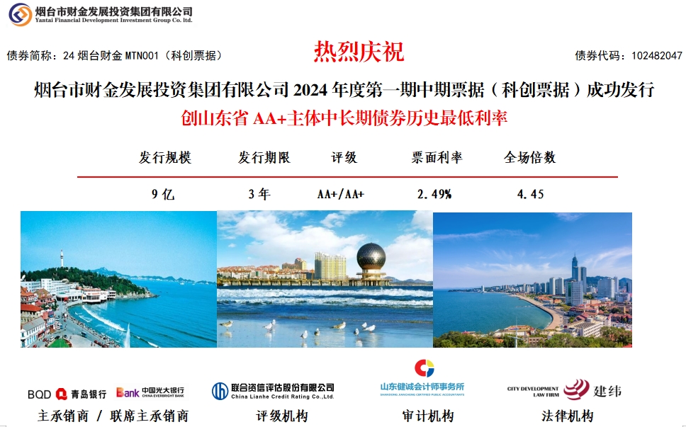5月24日,煙臺(tái)財(cái)金集團(tuán)2024年度第一期中期票據(jù)(科創(chuàng)票據(jù))成功發(fā)行。本次中期票據(jù)發(fā)行規(guī)模9億元,發(fā)行期限3年,票面利率2.49%,全場(chǎng)認(rèn)購(gòu)倍數(shù)4.45倍,創(chuàng)山東省AA+主體中長(zhǎng)期債券歷史最低利率。